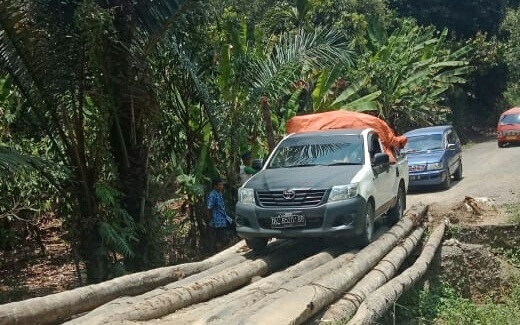 “Pengendara sekarang perlu ekstra hati-hati untuk melintasi karena masih menggunakan jembatan darurat dari batang pohon kelapa,” ujarnya.