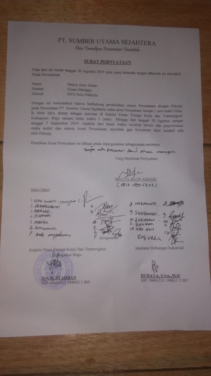 DEPOLICNEWS.COM. Sengkang – PT. Sumber Utama Sejahtera (SUS) di Wajo merupakan Perusahaan Swasta yang bergerak di bidang Perkebunan Kelapa Sawit menuai pelemik dengan karyawannya.
