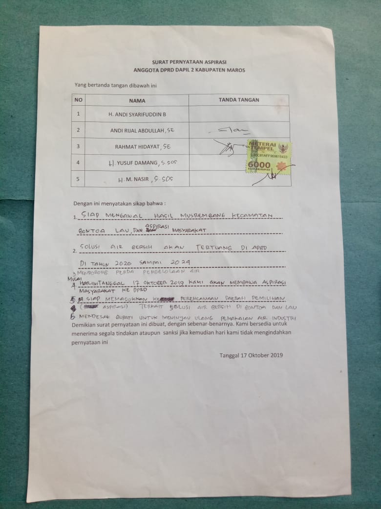 Dari 5 Anggota DPRD Dapil II Kabupaten Maros hanya tiga Anggota Dewan yang bersedia menandatangani surat pernyataan itu, yakni Muh Nasir, Andi Rijal Abdullah dan Rahmat Hidayat. Sedangkan dua lainnya tidak bersedia untuk menandatangani surat pernyataan tersebut.
